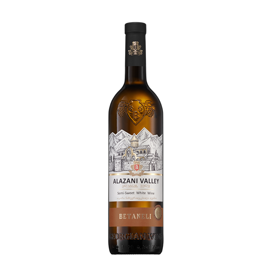 Betaneli Alazani Valley Semi-Sweet White to białe, półsłodkie wino z Kachetii, słynącej z produkcji delikatnych i aromatycznych win. Powstałe z gruzińskich szczepów, takich jak Rkatsiteli i Mtsvane, wino oferuje subtelny, owocowy bukiet z wyczuwalnymi nutami dojrzałych jabłek, gruszek oraz brzoskwiń, które nadają mu przyjemną słodycz i świeżość. Na podniebieniu wino jest zbalansowane, łagodne, z lekką kwasowością, która idealnie równoważy jego słodycz. To wino świetnie komponuje się z deserami, owocami, lekkimi sałatkami oraz daniami kuchni azjatyckiej, dodając każdemu posiłkowi wyjątkowego charakteru.